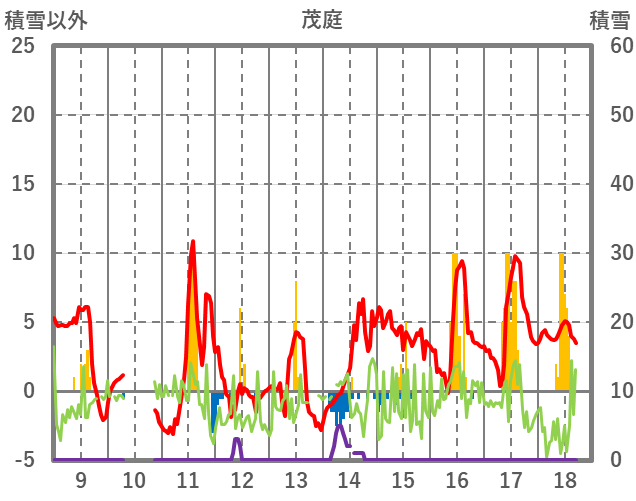 | 日 | 時 | 気温 | 降水 | 風向/風速 | 日照 | 積雪 | 降雪 |