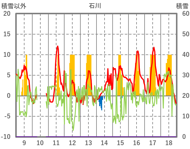 | 日 | 時 | 気温 | 降水 | 風向/風速 | 日照 | 積雪 | 降雪 |