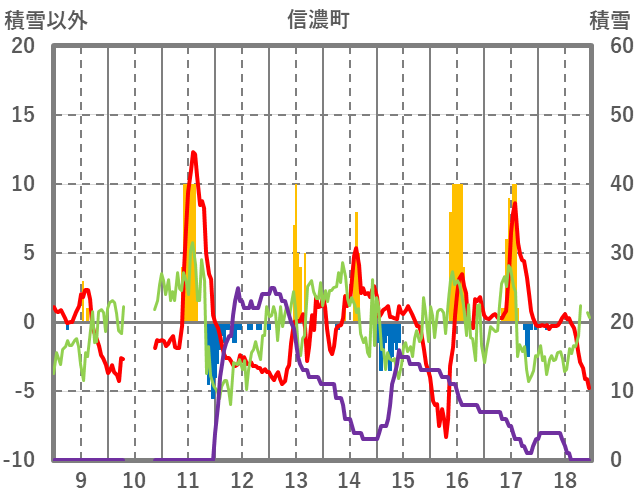 | 日 | 時 | 気温 | 降水 | 風向/風速 | 日照 | 積雪 | 降雪 |