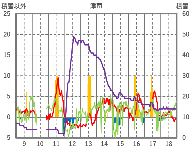 | 日 | 時 | 気温 | 降水 | 風向/風速 | 日照 | 積雪 | 降雪 |