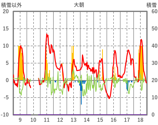 | 日 | 時 | 気温 | 降水 | 風向/風速 | 日照 | 積雪 | 降雪 |