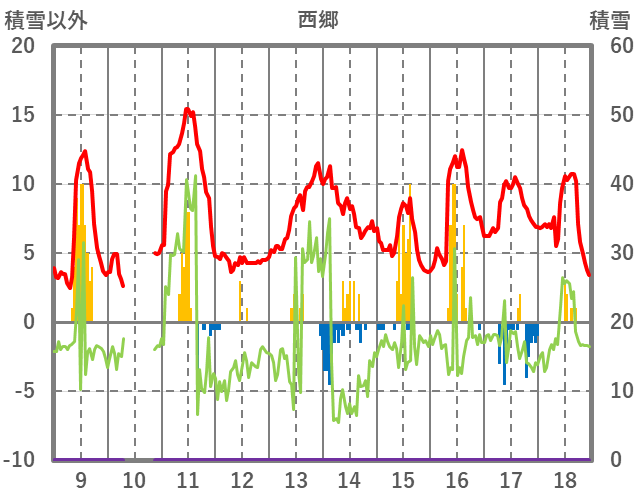 | 日 | 時 | 気温 | 降水 | 風向/風速 | 日照 | 積雪 | 降雪 |