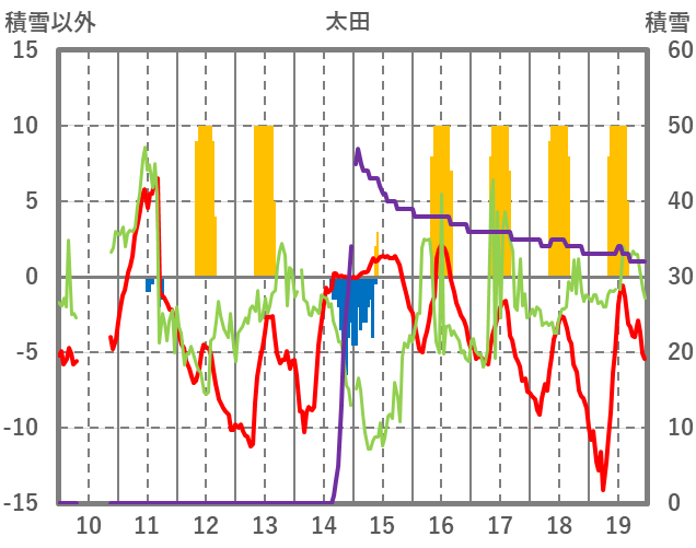 | 日 | 時 | 気温 | 降水 | 風向/風速 | 日照 | 積雪 | 降雪 |