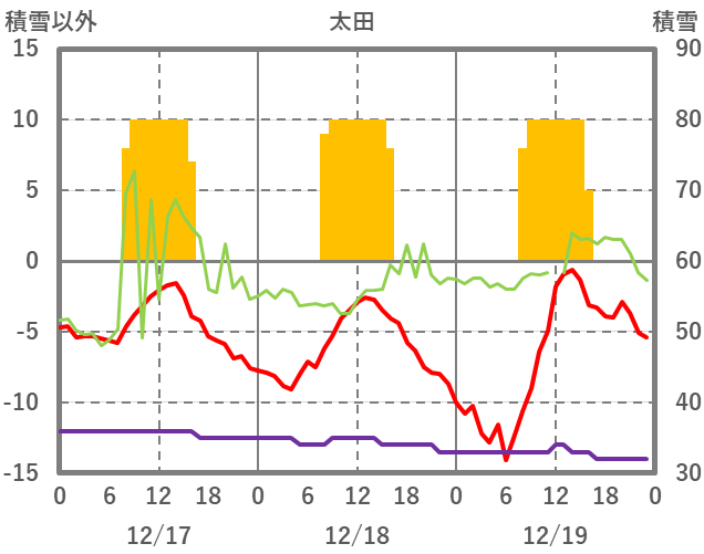 | 日 | 時 | 気温 | 降水 | 風向/風速 | 日照 | 積雪 | 降雪 |