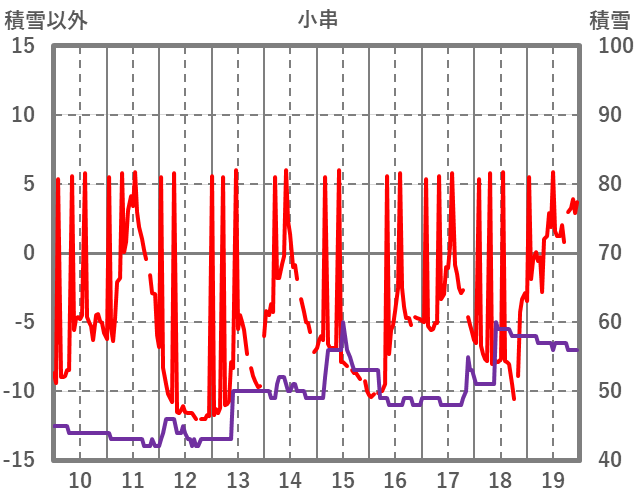 | 日 | 時 | 気温 | 降水 | 風向/風速 | 日照 | 積雪 | 降雪 |