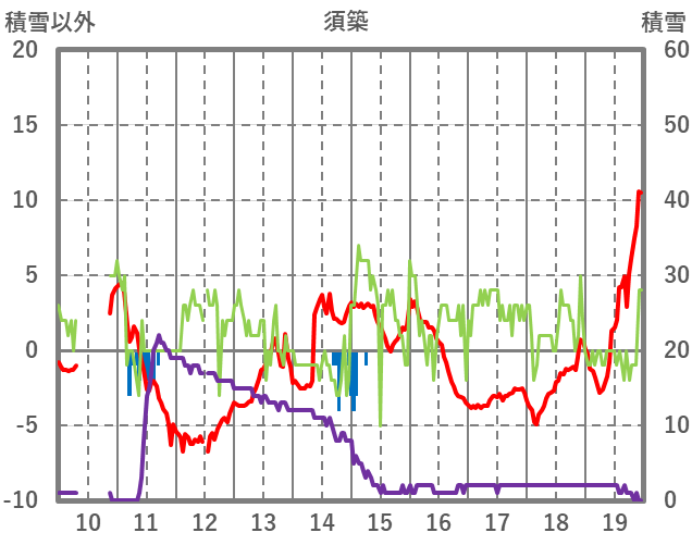 | 日 | 時 | 気温 | 降水 | 風向/風速 | 日照 | 積雪 | 降雪 |