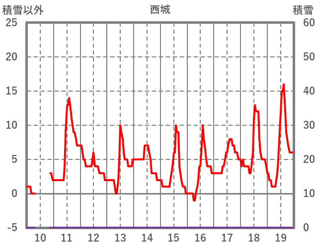 | 日 | 時 | 気温 | 降水 | 風向/風速 | 日照 | 積雪 | 降雪 |