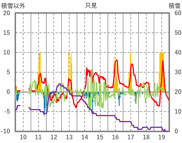 | 日 | 時 | 気温 | 降水 | 風向/風速 | 日照 | 積雪 | 降雪 |