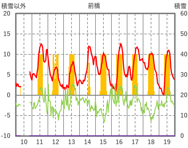 | 日 | 時 | 気温 | 降水 | 風向/風速 | 日照 | 積雪 | 降雪 |