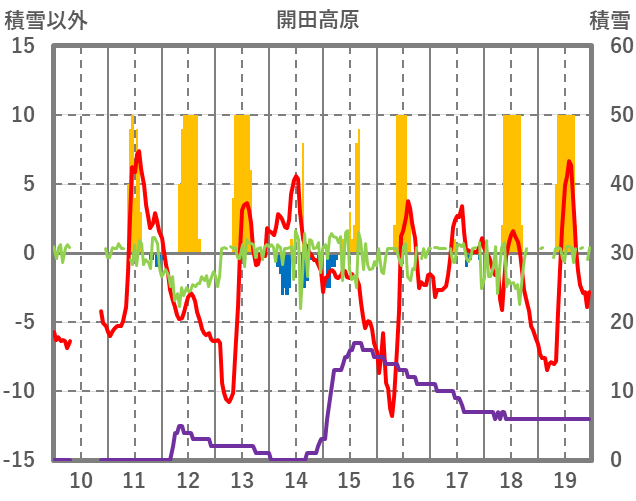| 日 | 時 | 気温 | 降水 | 風向/風速 | 日照 | 積雪 | 降雪 |