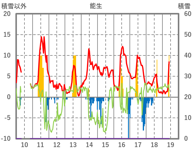 | 日 | 時 | 気温 | 降水 | 風向/風速 | 日照 | 積雪 | 降雪 |
