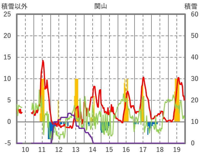 | 日 | 時 | 気温 | 降水 | 風向/風速 | 日照 | 積雪 | 降雪 |