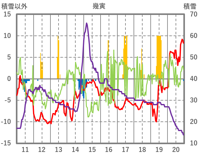 | 日 | 時 | 気温 | 降水 | 風向/風速 | 日照 | 積雪 | 降雪 |