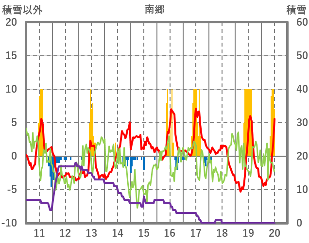 | 日 | 時 | 気温 | 降水 | 風向/風速 | 日照 | 積雪 | 降雪 |