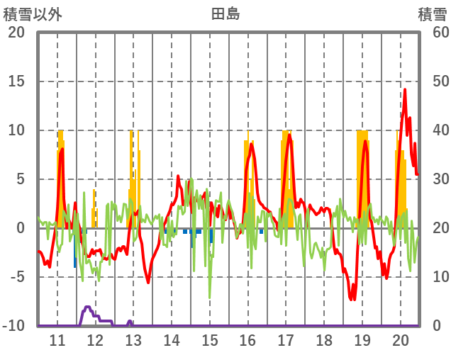 | 日 | 時 | 気温 | 降水 | 風向/風速 | 日照 | 積雪 | 降雪 |