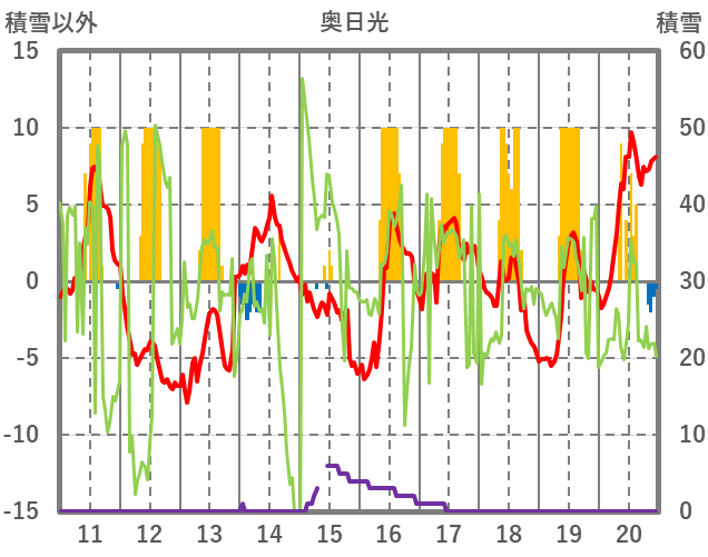 | 日 | 時 | 気温 | 降水 | 風向/風速 | 日照 | 積雪 | 降雪 |