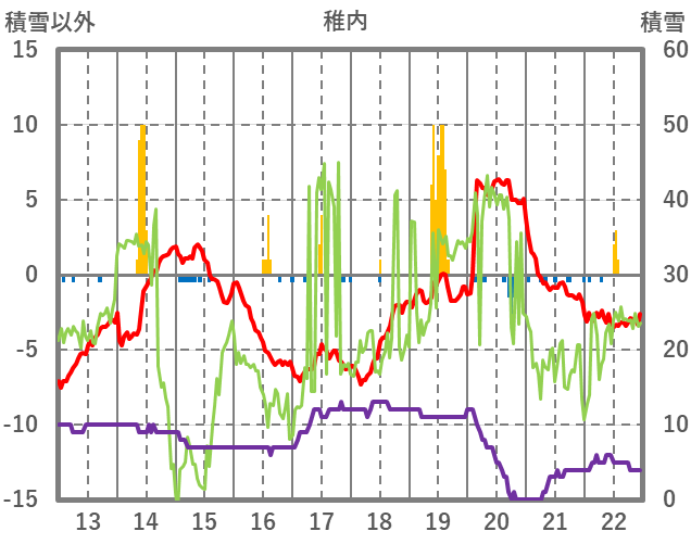 | 日 | 時 | 気温 | 降水 | 風向/風速 | 日照 | 積雪 | 降雪 |