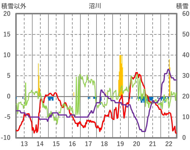 | 日 | 時 | 気温 | 降水 | 風向/風速 | 日照 | 積雪 | 降雪 |