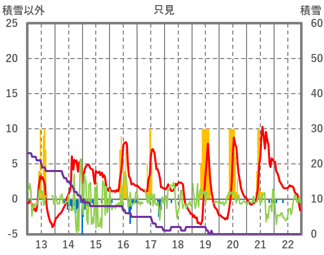 | 日 | 時 | 気温 | 降水 | 風向/風速 | 日照 | 積雪 | 降雪 |