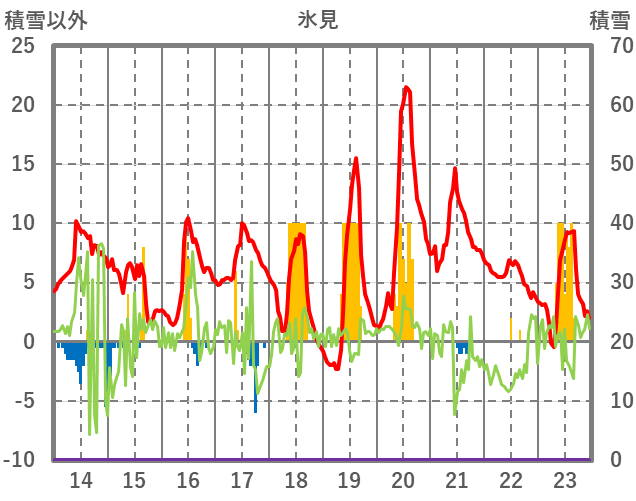 | 日 | 時 | 気温 | 降水 | 風向/風速 | 日照 | 積雪 | 降雪 |