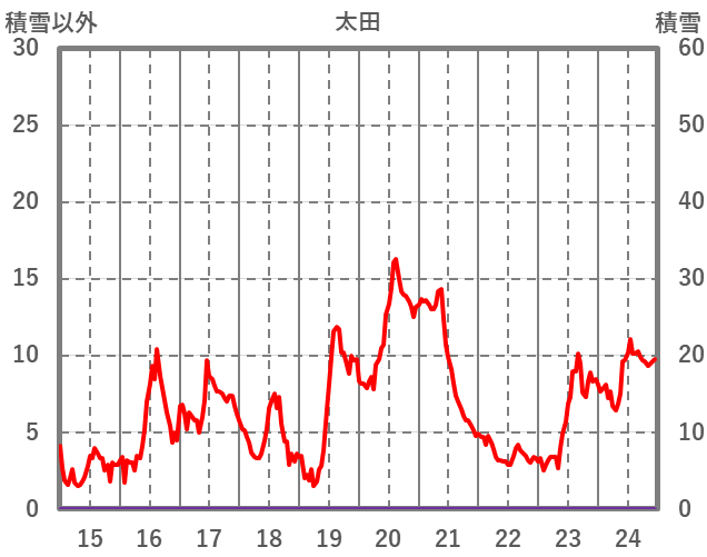 | 日 | 時 | 気温 | 降水 | 風向/風速 | 日照 | 積雪 | 降雪 |