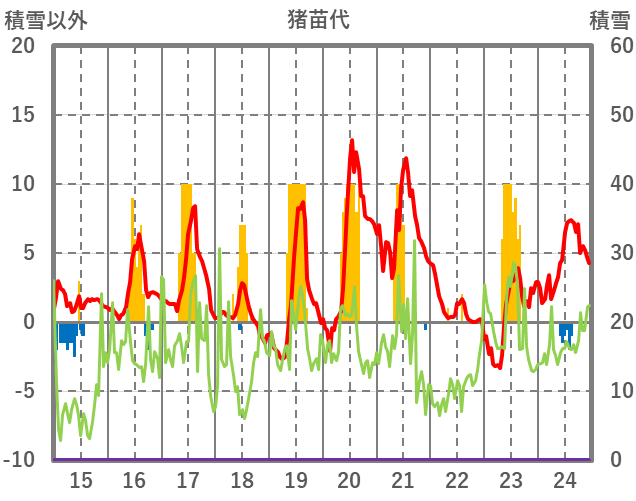 | 日 | 時 | 気温 | 降水 | 風向/風速 | 日照 | 積雪 | 降雪 |