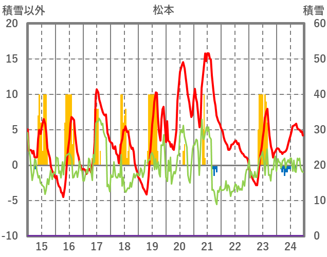 | 日 | 時 | 気温 | 降水 | 風向/風速 | 日照 | 積雪 | 降雪 |