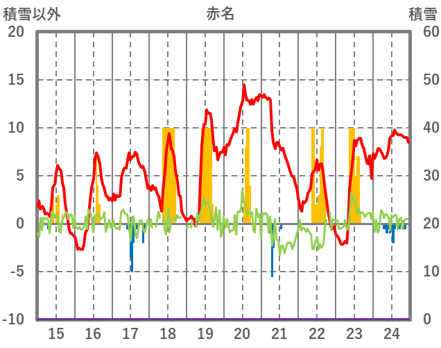 | 日 | 時 | 気温 | 降水 | 風向/風速 | 日照 | 積雪 | 降雪 |
