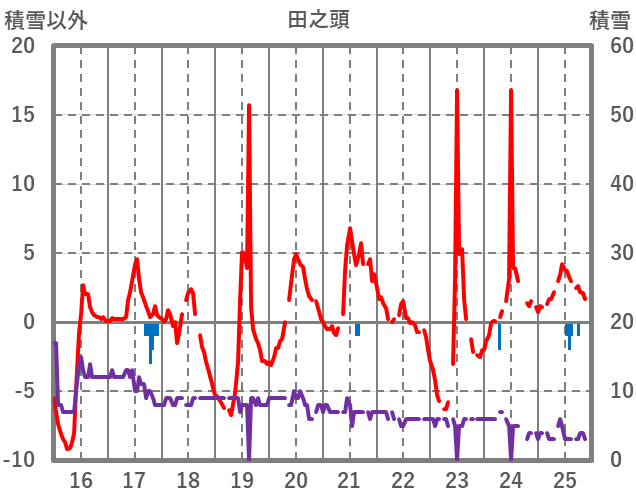 | 日 | 時 | 気温 | 降水 | 風向/風速 | 日照 | 積雪 | 降雪 |