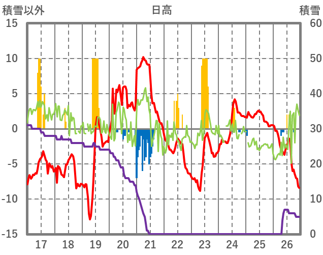| 日 | 時 | 気温 | 降水 | 風向/風速 | 日照 | 積雪 | 降雪 |