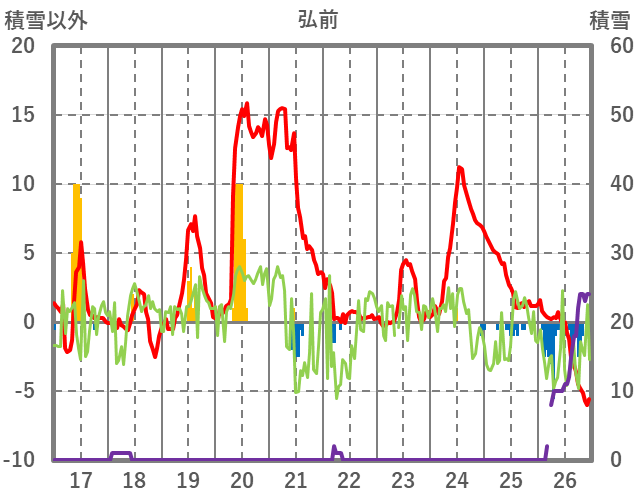 | 日 | 時 | 気温 | 降水 | 風向/風速 | 日照 | 積雪 | 降雪 |