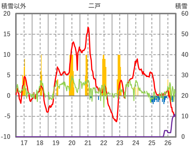 | 日 | 時 | 気温 | 降水 | 風向/風速 | 日照 | 積雪 | 降雪 |