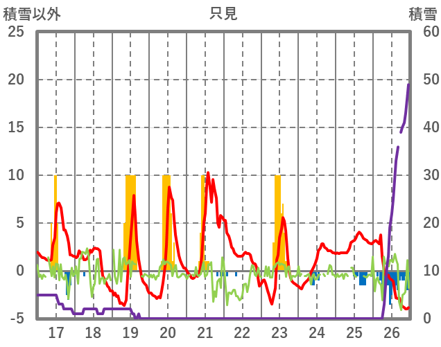 | 日 | 時 | 気温 | 降水 | 風向/風速 | 日照 | 積雪 | 降雪 |