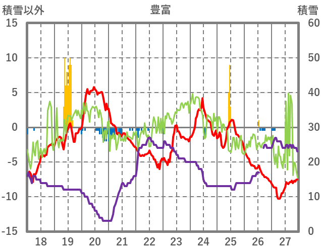 | 日 | 時 | 気温 | 降水 | 風向/風速 | 日照 | 積雪 | 降雪 |