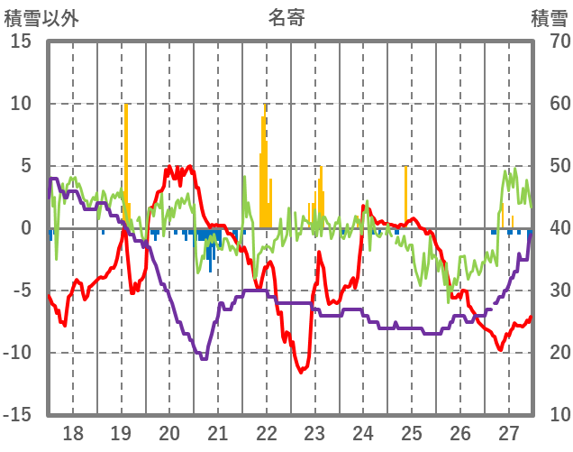| 日 | 時 | 気温 | 降水 | 風向/風速 | 日照 | 積雪 | 降雪 |