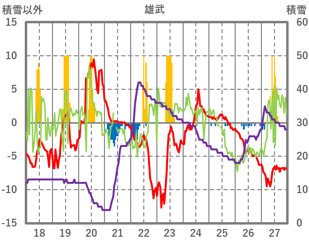 | 日 | 時 | 気温 | 降水 | 風向/風速 | 日照 | 積雪 | 降雪 |