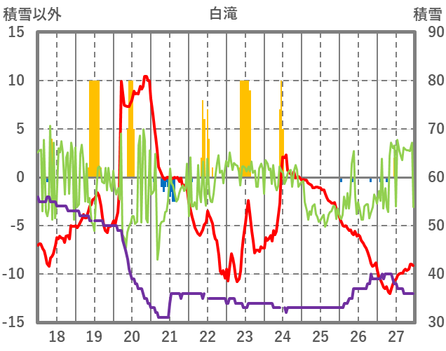 | 日 | 時 | 気温 | 降水 | 風向/風速 | 日照 | 積雪 | 降雪 |