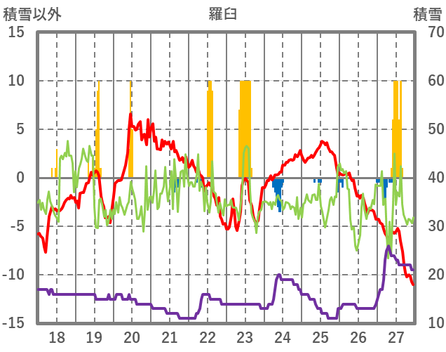 | 日 | 時 | 気温 | 降水 | 風向/風速 | 日照 | 積雪 | 降雪 |
