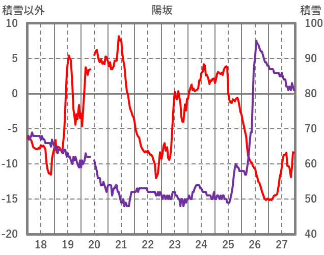 | 日 | 時 | 気温 | 降水 | 風向/風速 | 日照 | 積雪 | 降雪 |