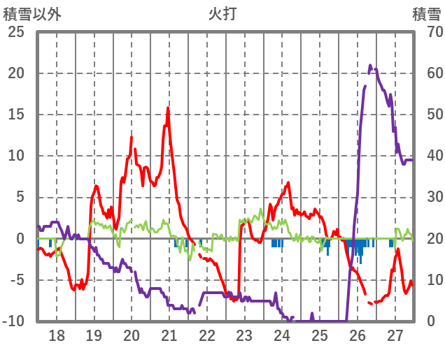 | 日 | 時 | 気温 | 降水 | 風向/風速 | 日照 | 積雪 | 降雪 |
