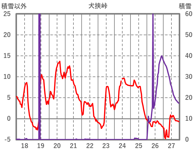 | 日 | 時 | 気温 | 降水 | 風向/風速 | 日照 | 積雪 | 降雪 |