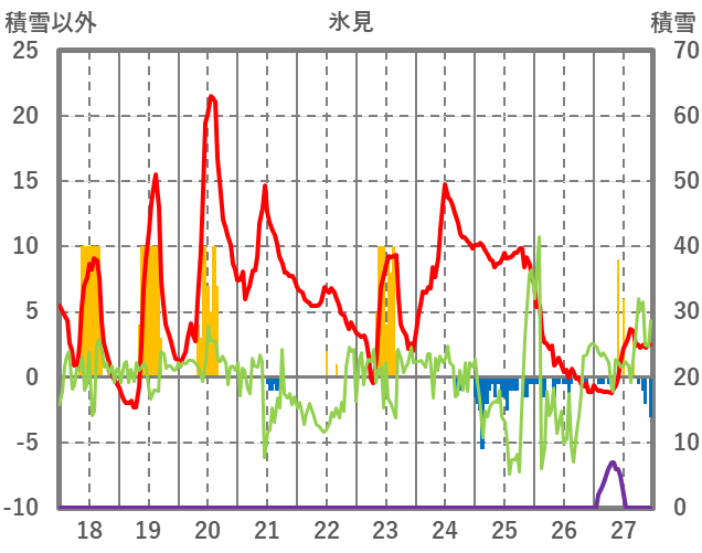 | 日 | 時 | 気温 | 降水 | 風向/風速 | 日照 | 積雪 | 降雪 |