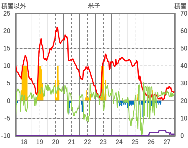 | 日 | 時 | 気温 | 降水 | 風向/風速 | 日照 | 積雪 | 降雪 |