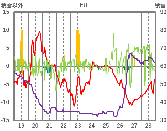 | 日 | 時 | 気温 | 降水 | 風向/風速 | 日照 | 積雪 | 降雪 |