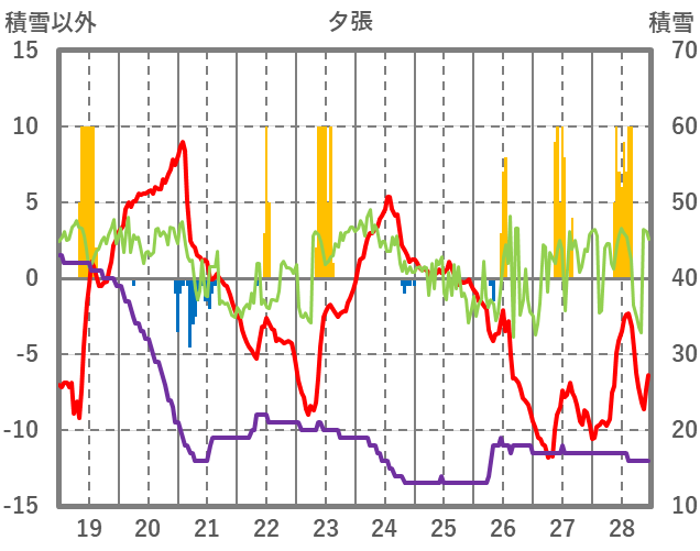 | 日 | 時 | 気温 | 降水 | 風向/風速 | 日照 | 積雪 | 降雪 |