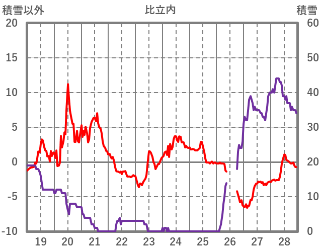 | 日 | 時 | 気温 | 降水 | 風向/風速 | 日照 | 積雪 | 降雪 |
