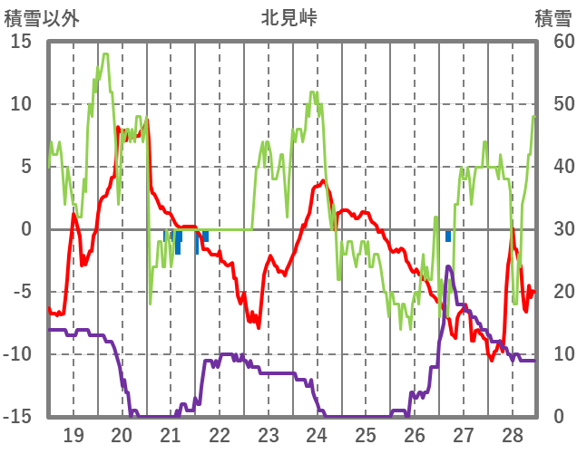 | 日 | 時 | 気温 | 降水 | 風向/風速 | 日照 | 積雪 | 降雪 |
