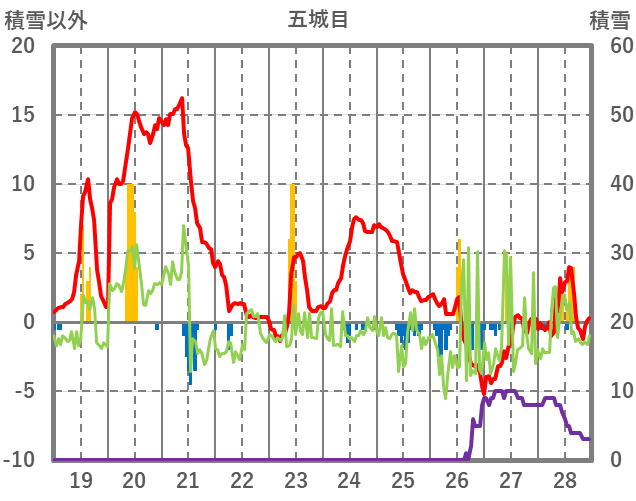 | 日 | 時 | 気温 | 降水 | 風向/風速 | 日照 | 積雪 | 降雪 |