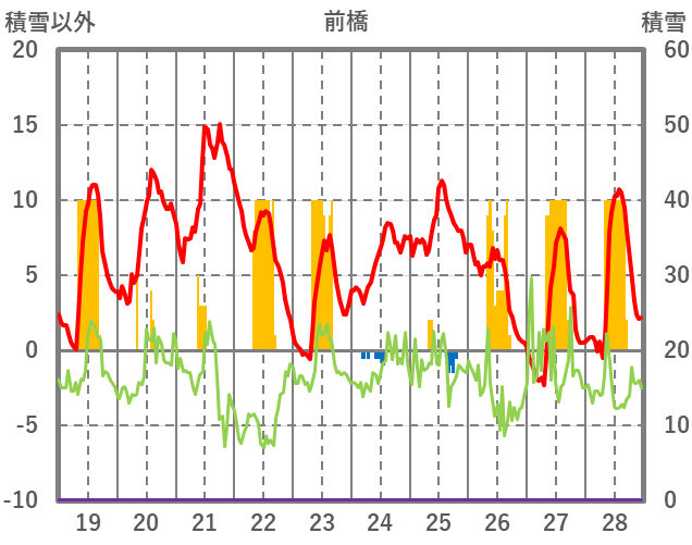 | 日 | 時 | 気温 | 降水 | 風向/風速 | 日照 | 積雪 | 降雪 |