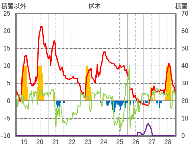 | 日 | 時 | 気温 | 降水 | 風向/風速 | 日照 | 積雪 | 降雪 |